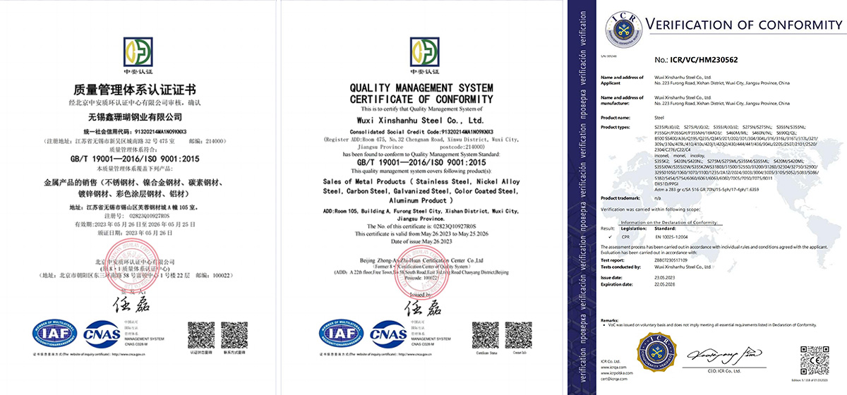 ASTM A240/A480, ASTM B688, ASTM B463/SB463, ASTM B168/SB168, ASTM B443/SB443, B424/SB424, B625/SB625, B575/SB575, JIS G4303, BS 1449, DIN17441, G4305 |